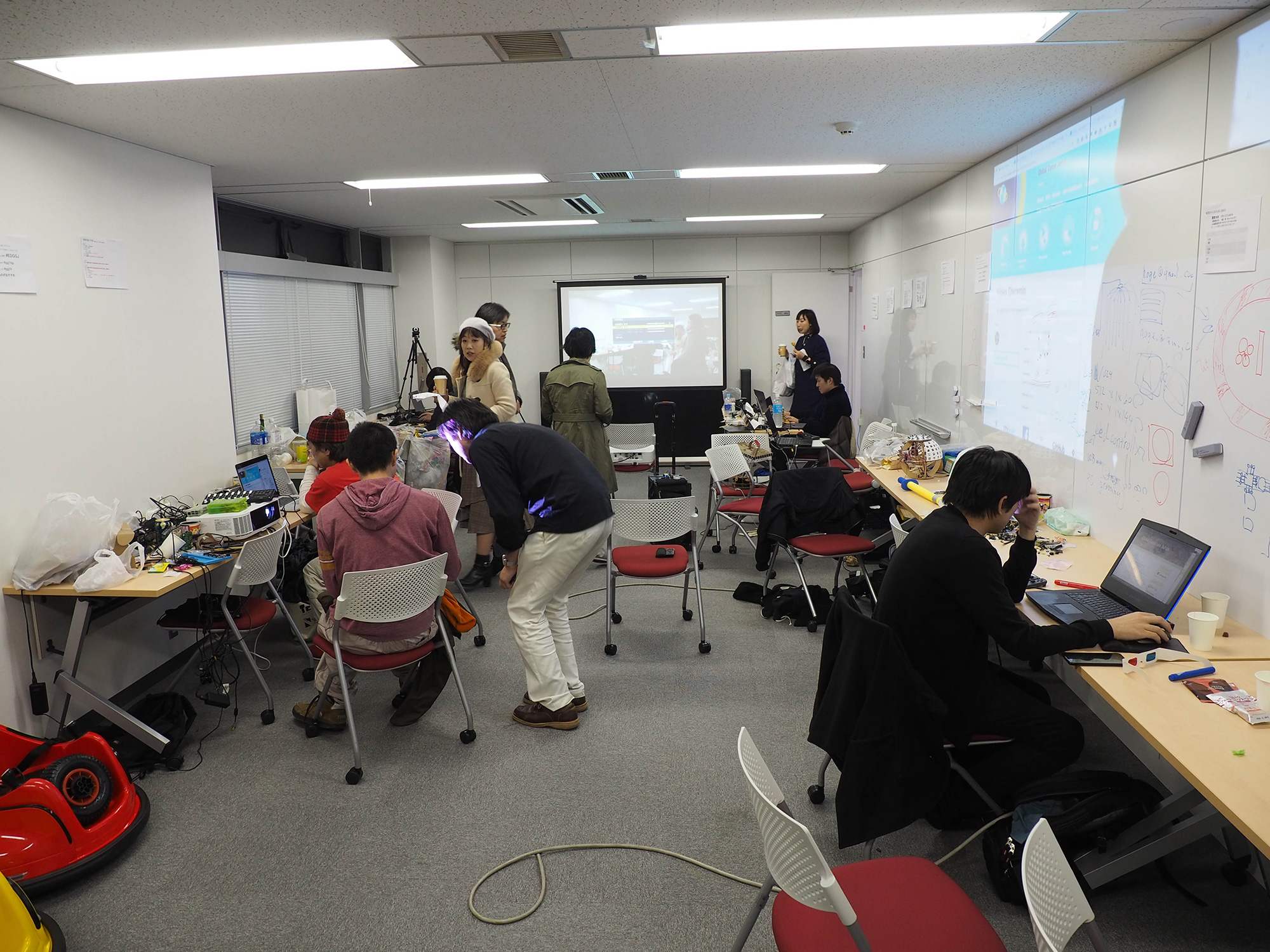 PH02 Published 2019年2月4日 at 2000 × 1500 in 【World MR News】実用性の高いゲームからシュールなハイテクバンドまで登場!? 「電子デバイスGlobal Game Jam 2019」電子デバイス会場をレポート ← Previous Next → コンパクトなスペースだが、ふた部屋を利用して作業が行われていた。