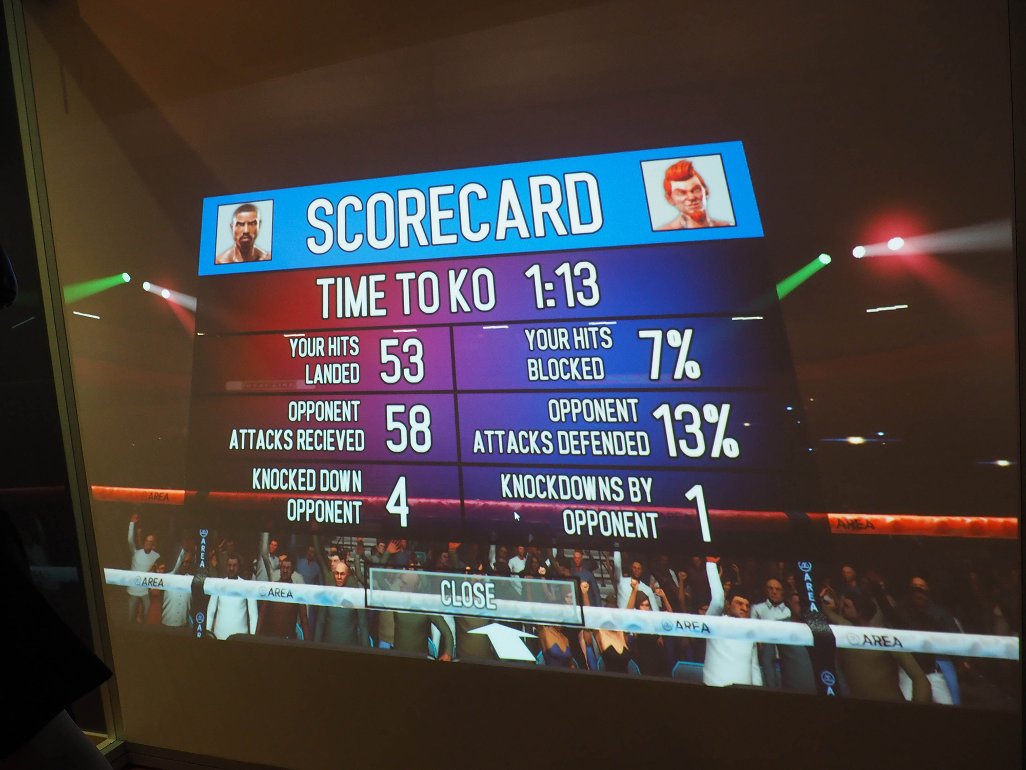 PH09 Published 2019年5月27日 at 2000 × 1500 in 【World MR News】映画『ロッキー』シリーズのキャラクターたちとVRで対戦できる! VR体験施設「Survios Virtual Reality Arcade」が東京ミッドタウン日比谷「BASE Q」に期間限定オープン ← Previous Next → ▲こちらは別の対戦相手の画面だが、相手をマットに沈めることができると、最後にスコアが表示される。